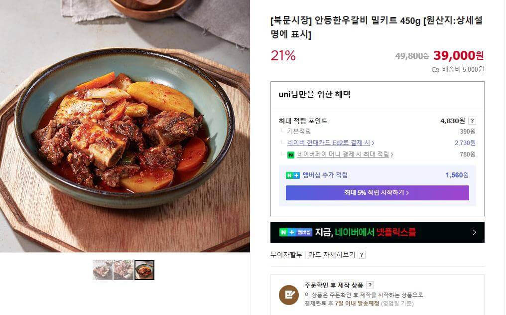 - 안동갈비 밀키트: 39,000원 (정가 49,800원에서 할인 중)